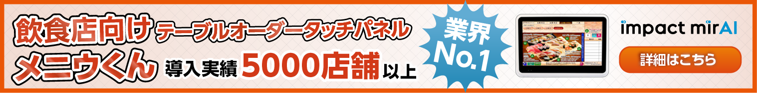 メニウくん特許取得済!業界唯一のフリーレイアウト画面を採用したセルフオーダーシステム「メニウくん」。さらに、飲食店オーナーさんが一番気にする故障対応も特許取得済のタッチパネルを充電器に差替えるだけで交換可能なスワップ機能を搭載!また他のセルフオーダーシステムとは違い万一故障してもパーツごとの交換が可能なので、後々のトラブルにもなりにくいのが特徴!サポート体制も24時間365日で2,000店舗以上のサポート体制もある!意外と陥りがちな通信環境の安定性も現場調査を事前に行ってくれるので、安心して任せられる業者さんです!